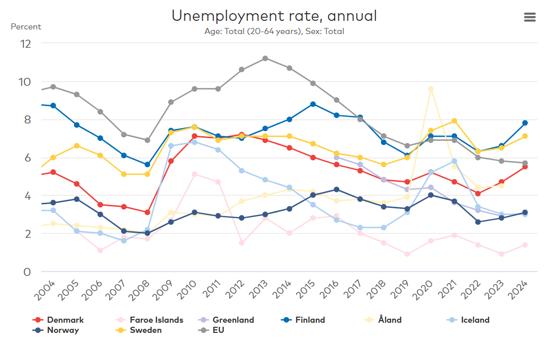 The EU average unemployment rate has remained high since 2004. Since the pandemic however, both Sweden and Finland have reported higher levels of unemployment than the EU average. Finland reported the highest unemployment rate in 2024 at 7.8%, followed by Sweden at 7.1%. For the past two years, the unemployment rate has increased in Sweden, Finland, Denmark and Norway. In the same time period, the unemployment rate has continued to decrease in the EU.