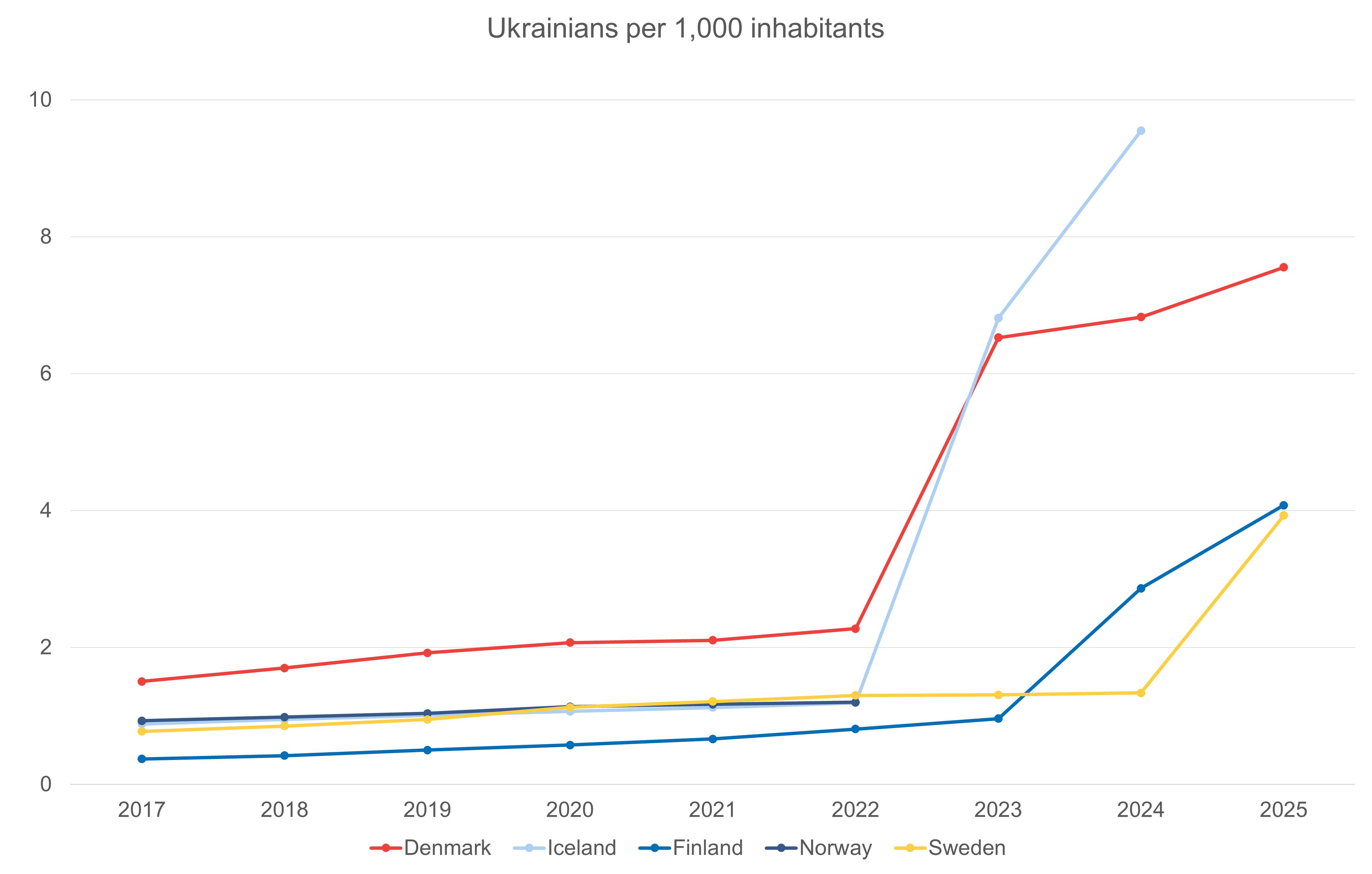 Since Russia’s invasion in 2022 up until 2025, the largest increase relative to the population size can be observed in Iceland [2], where Ukrainians have increased from 1.2 to 9.5 per 1,000 inhabitants. This is followed by Denmark (2.3 to 7.6), Finland (0.8 to 4.1) and Sweden (1.3 to 3.9).