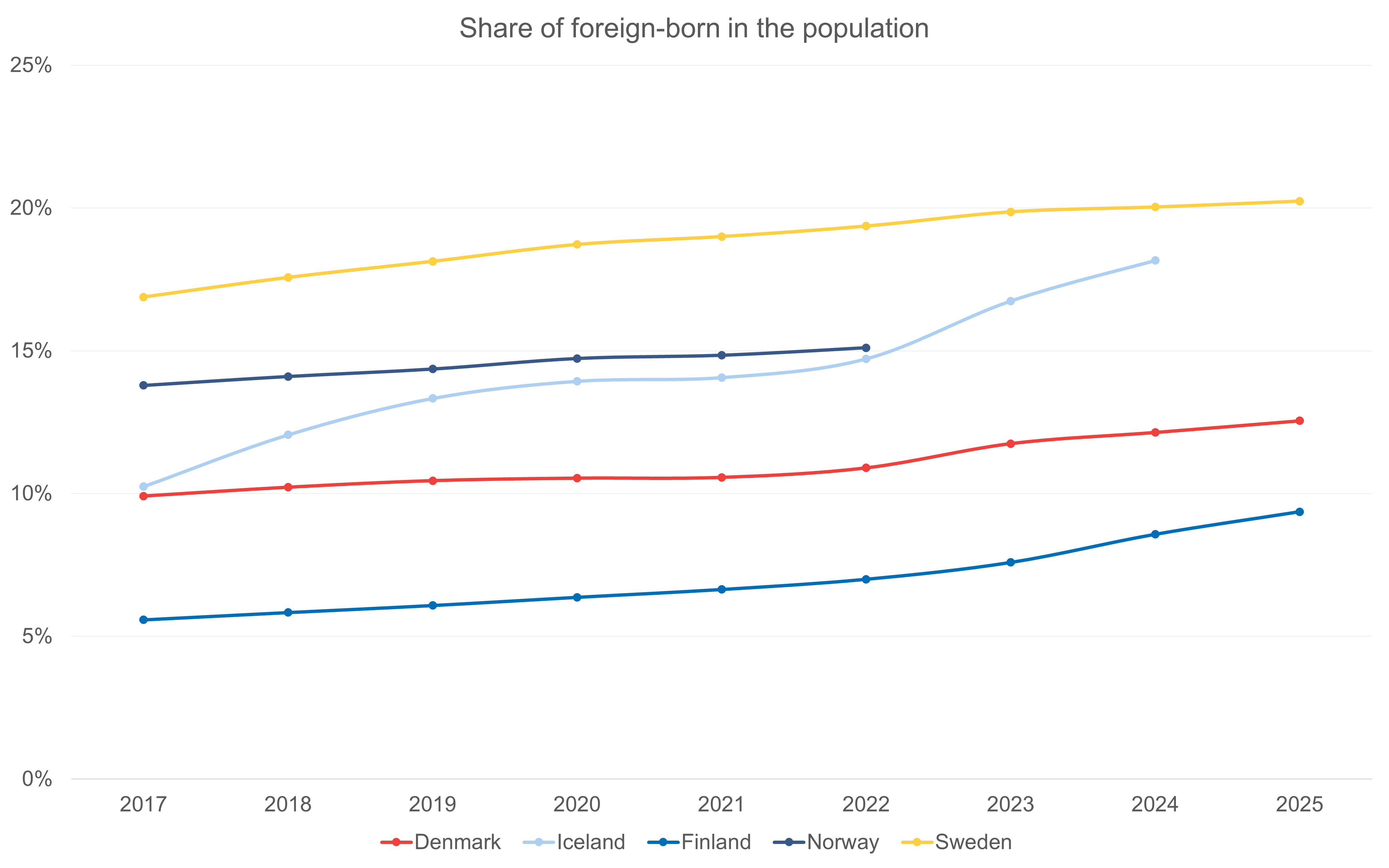 By 2025, the foreign-born population accounted for the largest share of the total population in Sweden at 20 percent, followed by 18 percent in Iceland (2024).