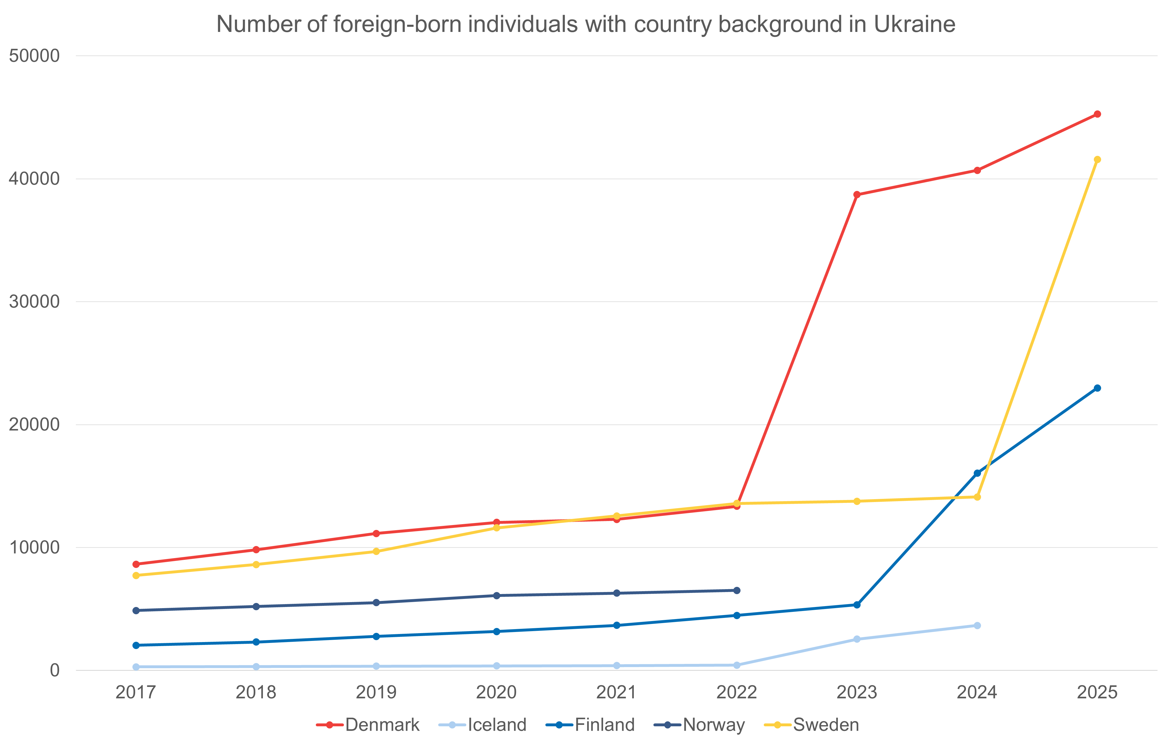All Nordic countries have reported increases in individuals with a Ukrainian background since 2022. In absolute terms, the largest increase since 2022 can be seen in Denmark (32,000), followed by Sweden (28,000) and Finland (18,500).