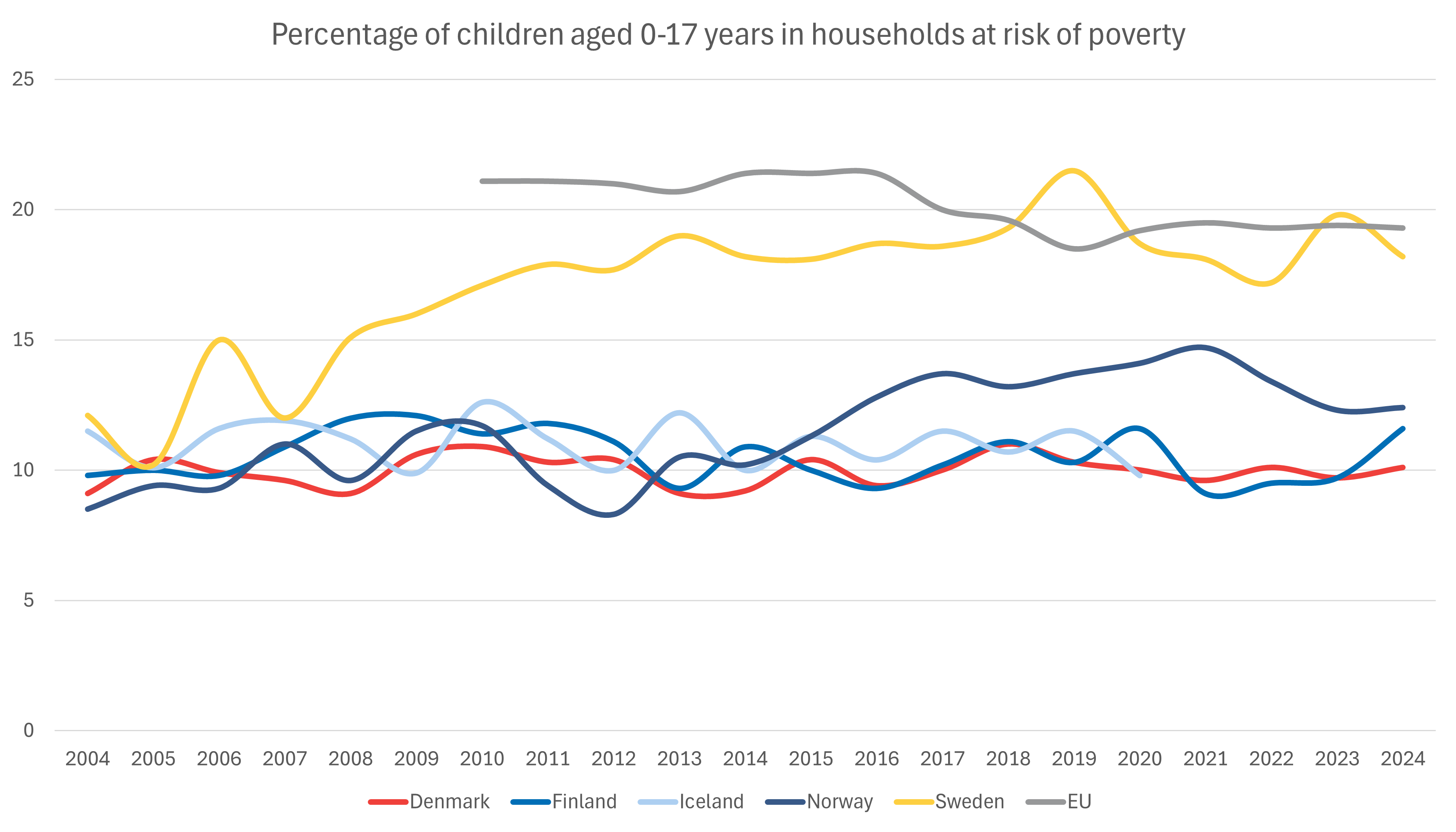 Since 1990, Sweden has had a larger share of children in households at risk of poverty compared to their Nordic neighbours, but the difference has increased over time. The increase that began during the 2008 financial crisis has continued since then. The EU average has decreased slowly but steadily since 2010, with an increase during the pandemic years of 2020 and 2021.