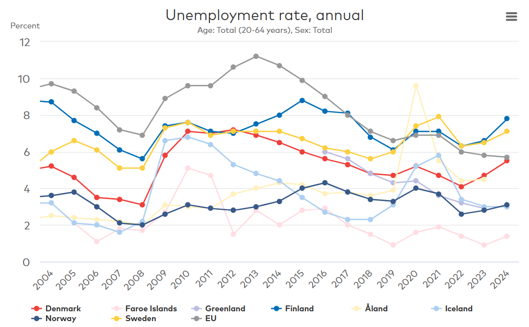 The EU average unemployment rate has remained high since 2004. Since the pandemic however, both Sweden and Finland have reported higher levels of unemployment than the EU average. Finland reported the highest unemployment rate in 2024 at 7.8%, followed by Sweden at 7.1%. For the past two years, the unemployment rate has increased in Sweden, Finland, Denmark and Norway. In the same time period, the unemployment rate has continued to decrease in the EU.
