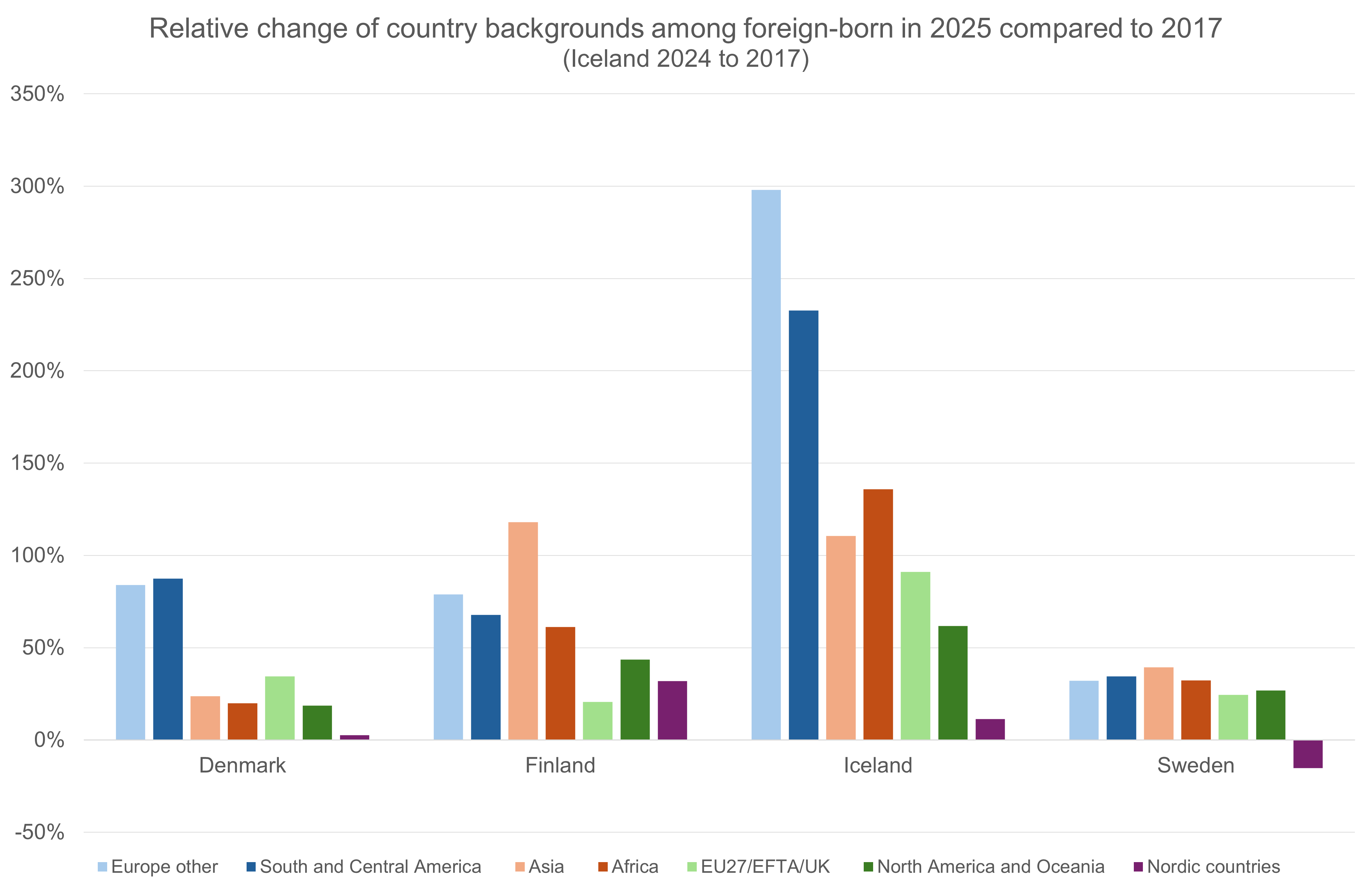 Iceland - which reported the largest relative increase of foreign-born individuals from 2017 to 2024 – has consequently observed the largest relative increases in almost all population groups. Foreign-born individuals from ‘Europe other’ have increased by almost 300 percent in Iceland from 2017 to 2024, whereas individuals with a country background from South and Central America have increased by 230 percent. It is worth noting that the increases in Iceland are from low volumes. For example, the number of individuals with a country background from ‘Europe other’ have increased by about 5,000 individuals in Iceland, compared to more than 60,000 in Finland and Sweden respectively.
