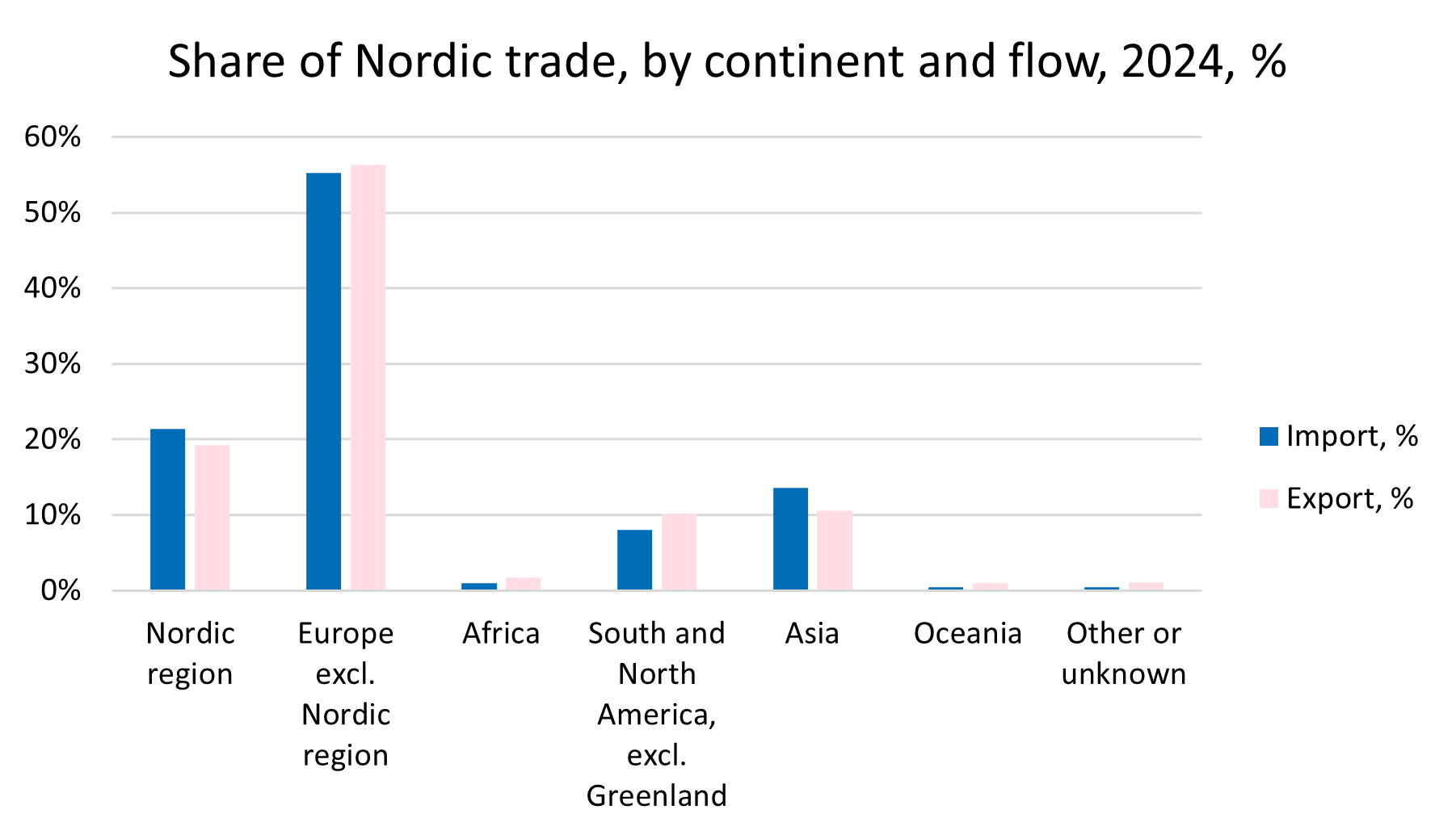 The trade between the Nordic countries is considerable. Of the combined value of all imports and exports in 2024, 21 and 19% respectively came from a Nordic country. Europe, excluding the Nordic countries, is the largest market, with a 55% share of imports and a 56% share of exports in 2024. Asia accounts for 14% of imports and 11% of exports, while South and North America has a combined share of 8% of imports and 10% of exports. [1] This distribution of flows in foreign trade has been relatively steady over the last 20 years.